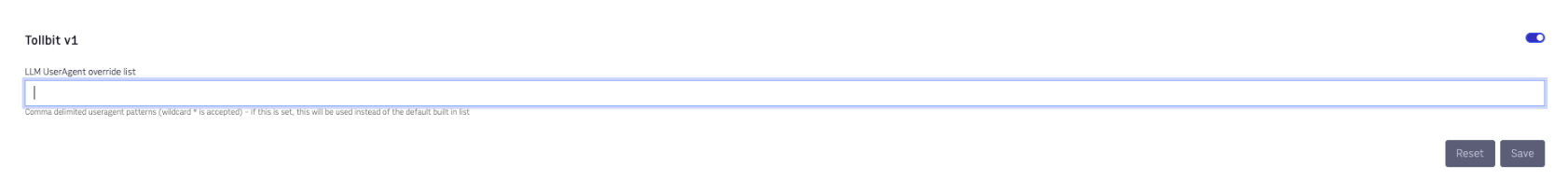 Note: the Override list text entry is there if you don't want to allow any of the following AI agents to be sent to the TollBit subdomain. Please use commas to separate multiple user agents. The default list includes the following bots: